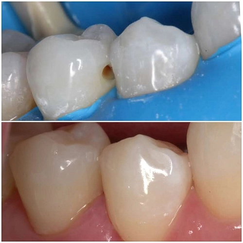 Кариес находился на средней стадии, но не вызывал у пациента дискомфорта. Если бы он не пришел на профилактический осмотр, средний кариес мог бы прогрессировать, что в итоге привело бы к более серьезным проблемам — от пульпита до периодонтита и удаления зуба.