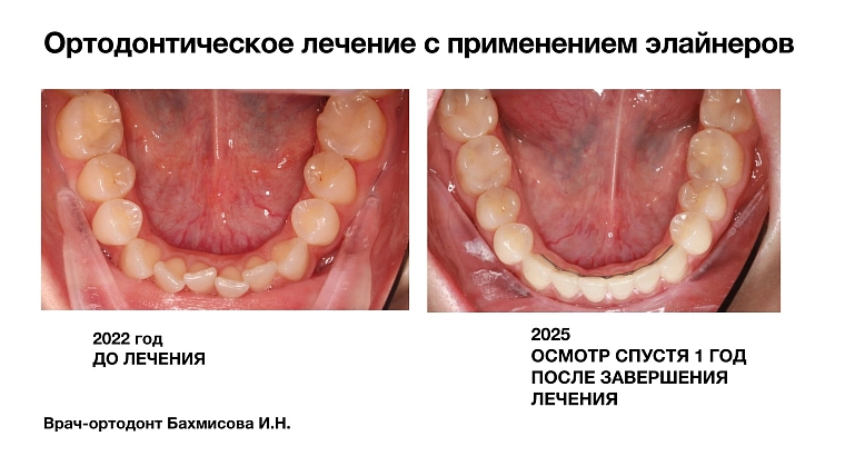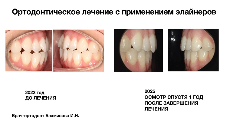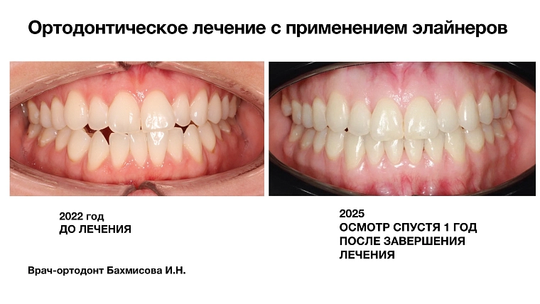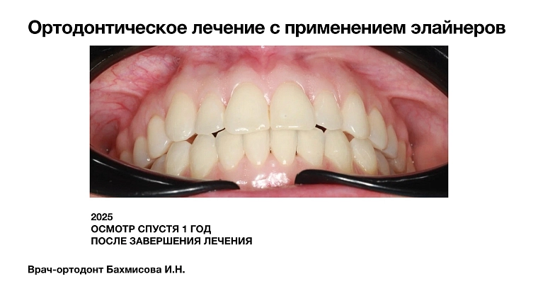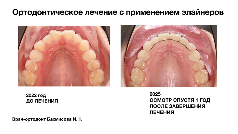На фото клинический случай лечения на элайнерах (срок лечения 2 года)