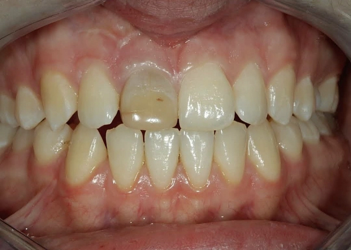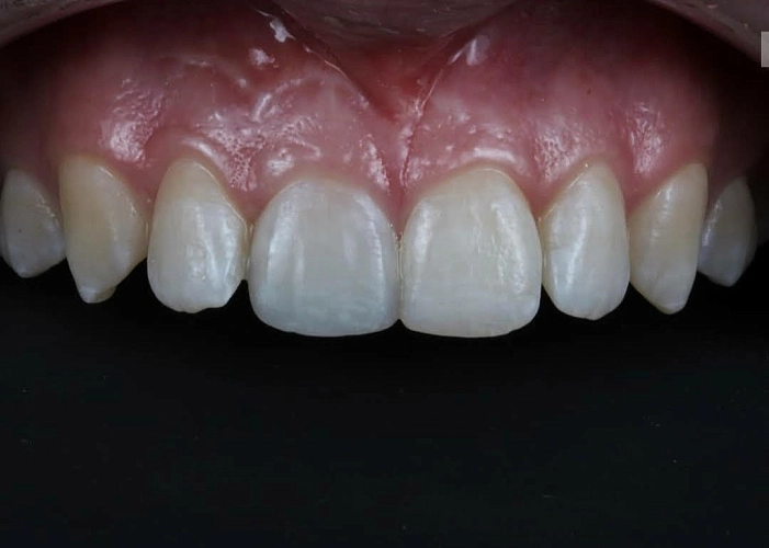 Вот и итог сложной реставрации. На этот результат ушло пол года. Для того, чтобы подготовить зуб и устранить источник инфекции из корня и кости, потребовалось перелечивание канала, проведение резекции верхушки корня, 3 посещения на реставрационный этап, включающий эндодонтическое отбеливание зуба, реставрацию с применением композитных красок и, непосредственно, коррекцию контуров зуба. Была предложена десневая коррекция, но пациенка от нее отказалась, оставшись довольна имеющимся результатом.