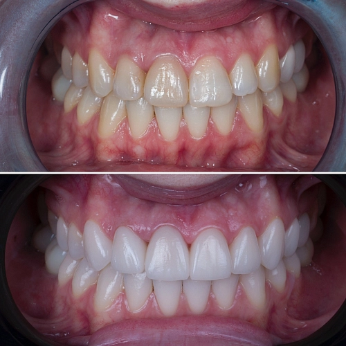 На представленном фото запечатлен результат эстетической и функциональной реабилитации пациентки. В ходе лечения было проведено отбеливание зубов, за которым последовала установка шести керамических виниров. Виниры выполнены в цвете B1, что придает улыбке естественность и гармонию.