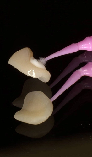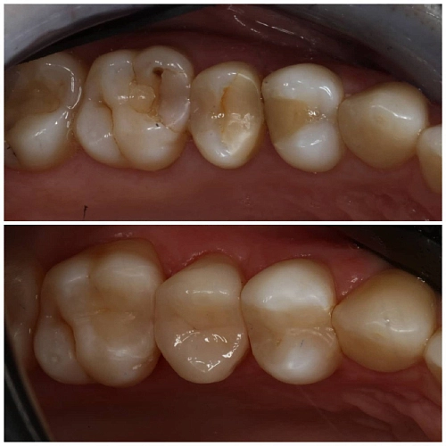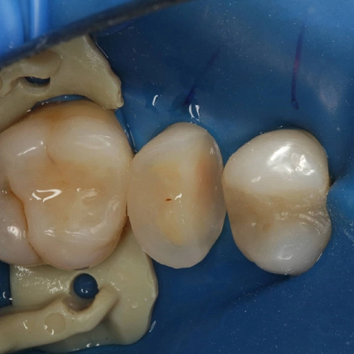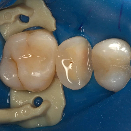 Выполнена реставрация двух жевательных зубов , на один из зубов с сильно разрушенной поверхностью установлена защищающая от перегрузки зуба керамическая накладка.