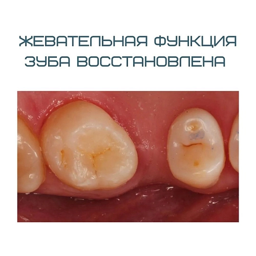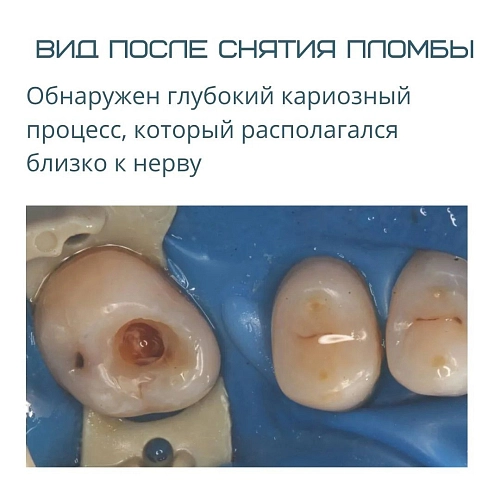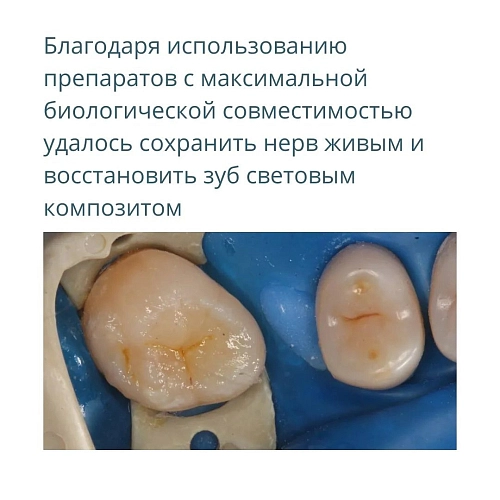 В карусели представлен процесс лечения глубокого кариозного процесса, который располагался близко к пульповой камере.