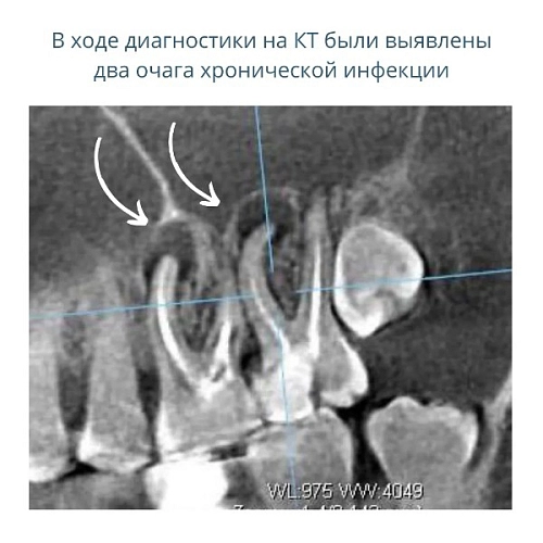 В ходе диагностики на КТ были выявлены два очага хронической инфекции и зубы подлежали немедленному лечению.