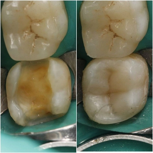 Проведено лечение глубокой кариозной полости с реставрацией жевательной поверхности зуба.