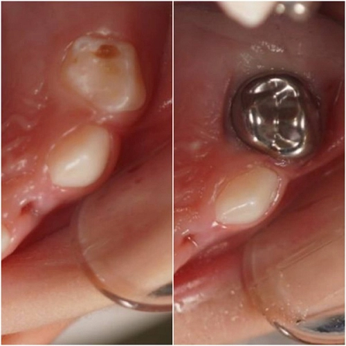 Когда придет время, коронка вместе с собственным зубом выпадет, не мешая физиологической смене прикуса.