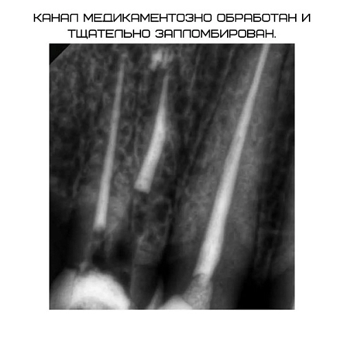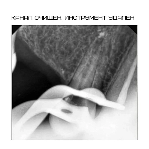 Инструмент успешно извлечен и канал медикаментозно обработан и тщательно запломбирован.
