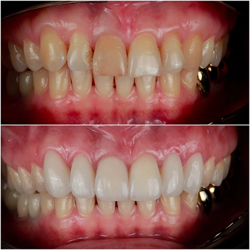 Проведено отбеливание зубов и установка виниров.