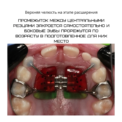 На представленном клиническом случае демонстрируется использование несъемного расширяющего аппарата Марко Росса, результат за 1 месяц лечения. В течение последующих 7-8 месяцев аппарат будет также работать в полости рта, но уже для стабилизации результата.